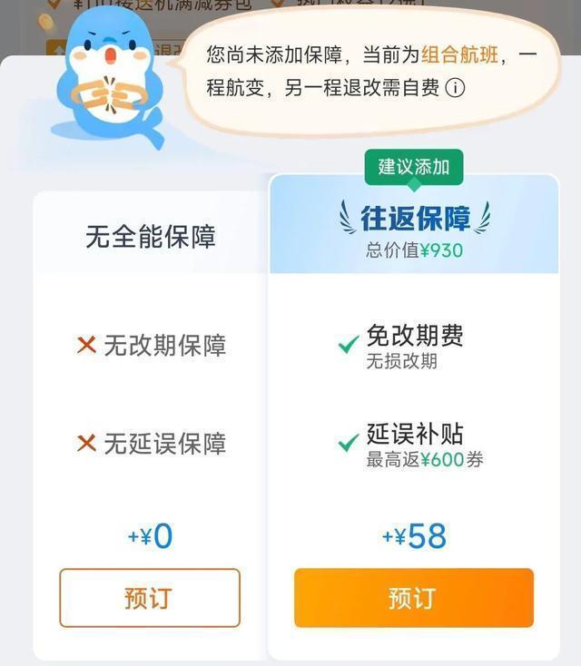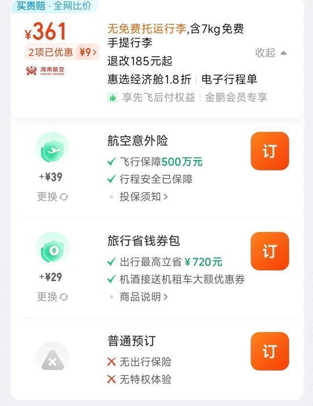 退出后再选361元的票价,王先生又看到三个附加选项:39元的航空或然险、29元的旅行省钱券包,以及不荒谬收费的“浅薄预定”。