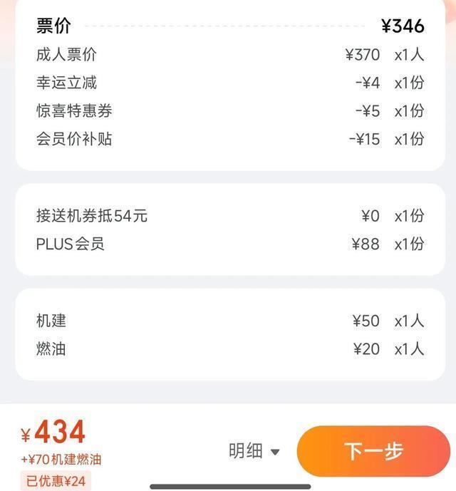 但算下来的价钱让他犯了蒙:346元加上70元机建燃油费,即便不疏通24元优惠,总价最多416元,可平台自满的支付价却是434元。点开明细才发现,差价里藏着一个无法取消的PLUS会员费,而统共页面根本莫得勾选该选项的进口。