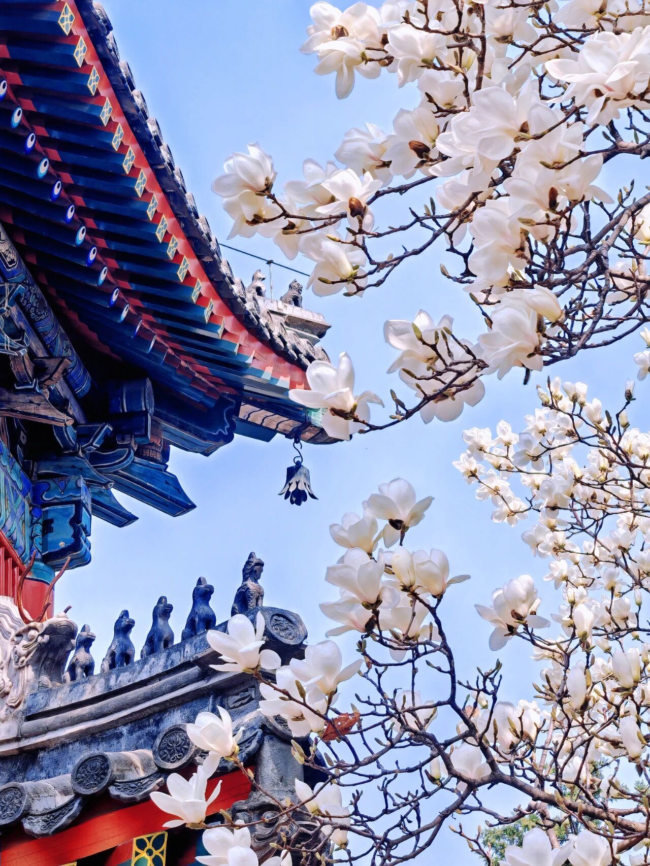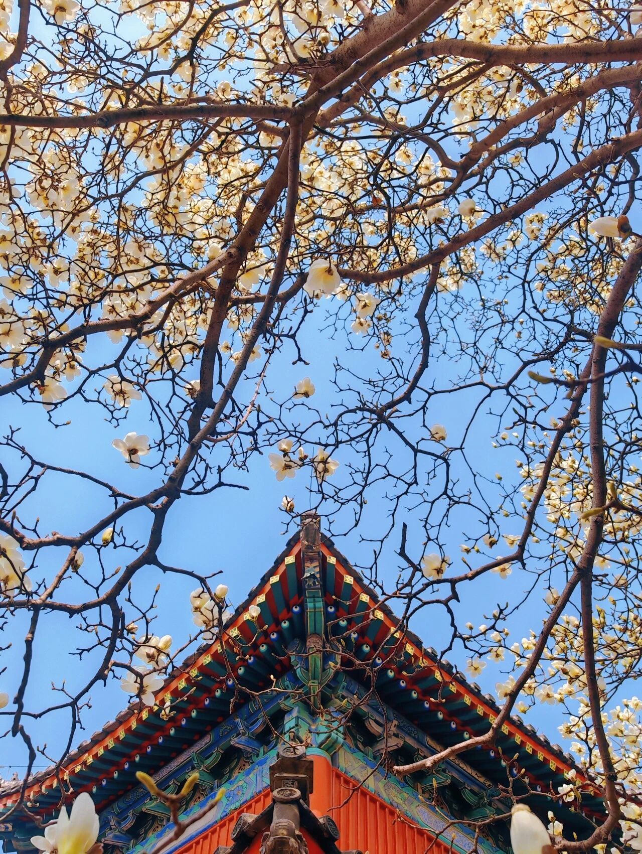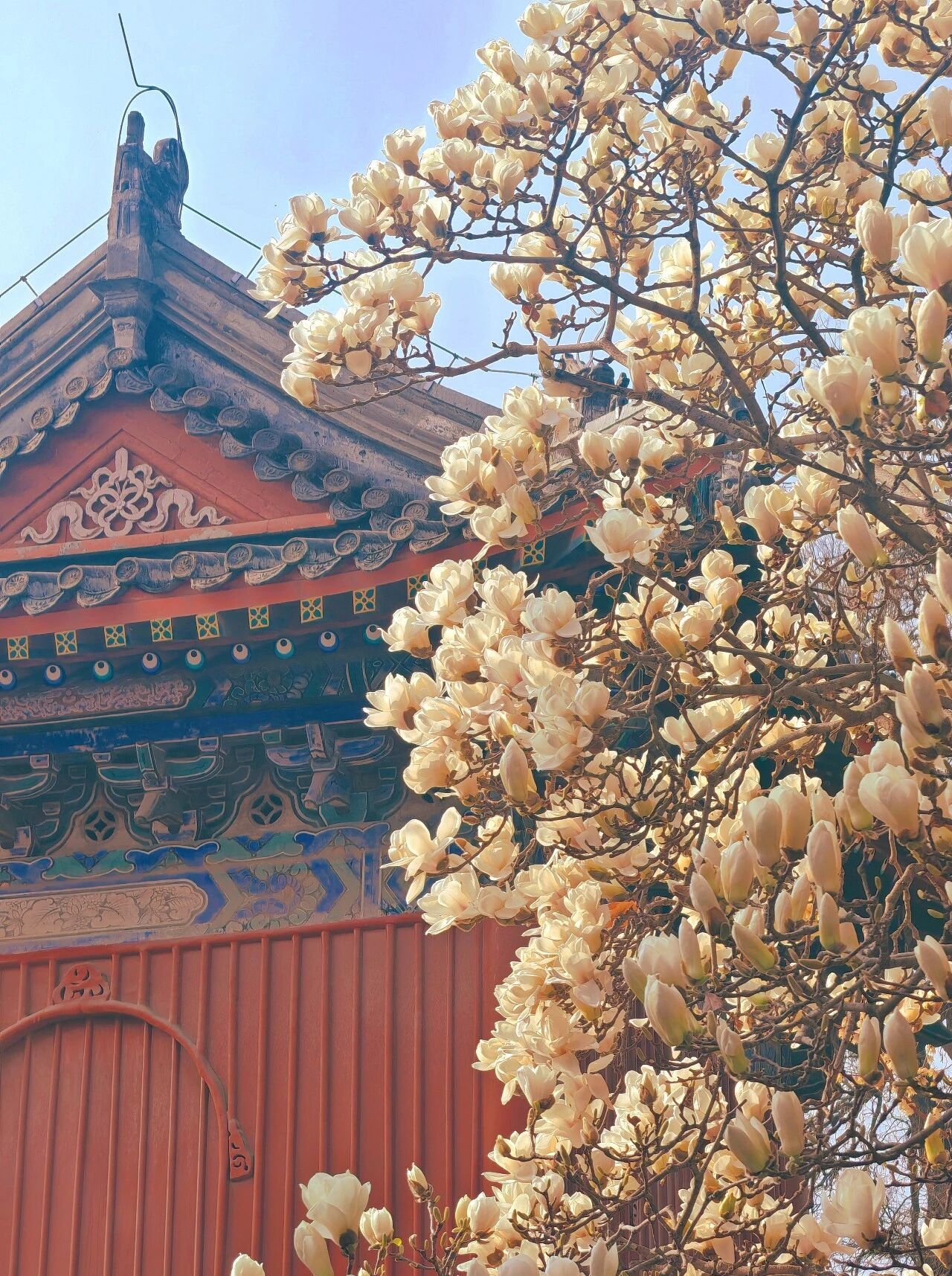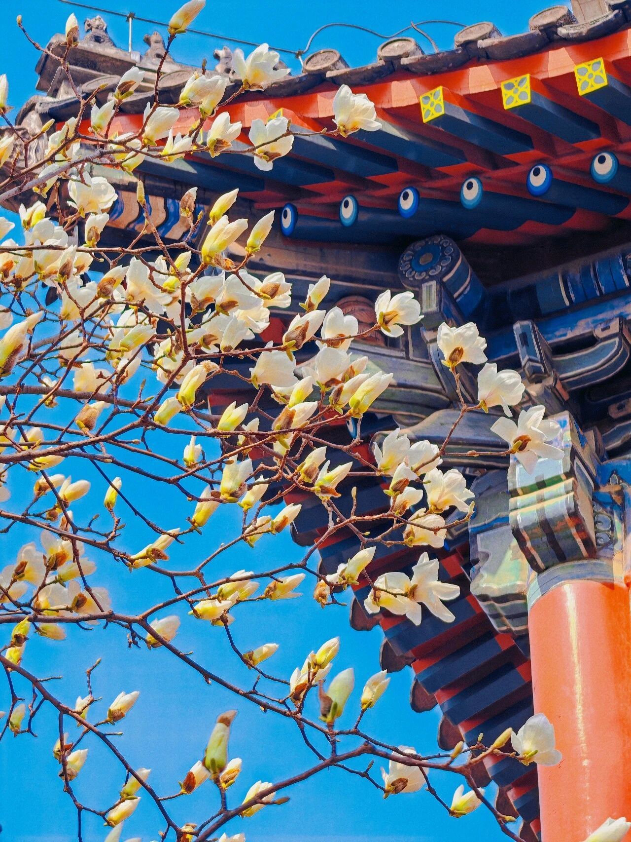 2.尝试不同角度:低角度仰拍,可凸起玉兰花的挺拔清丽;高角度俯拍,能展现古寺与玉兰相映的全貌;侧面取景,则更能发达玉兰花舒展优雅的姿态。