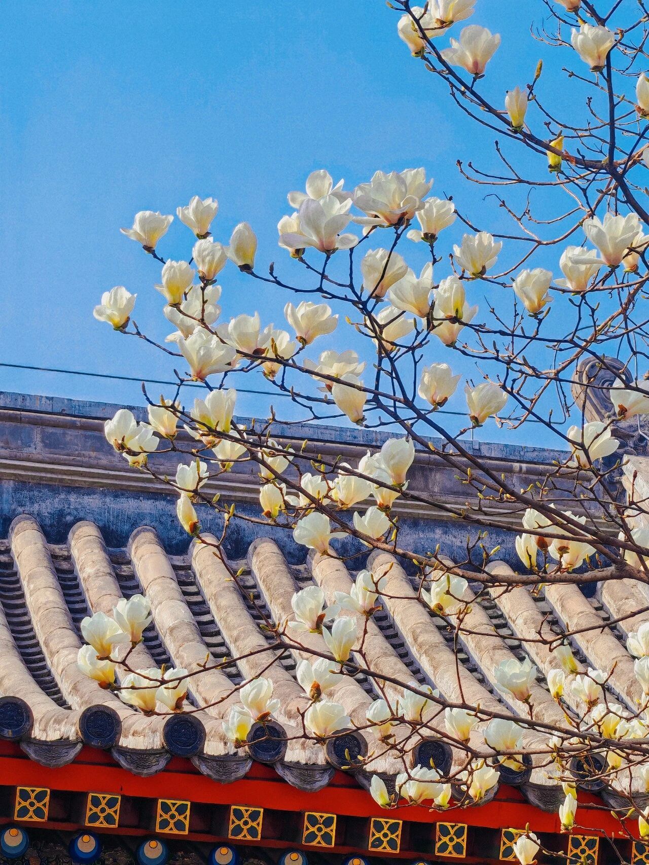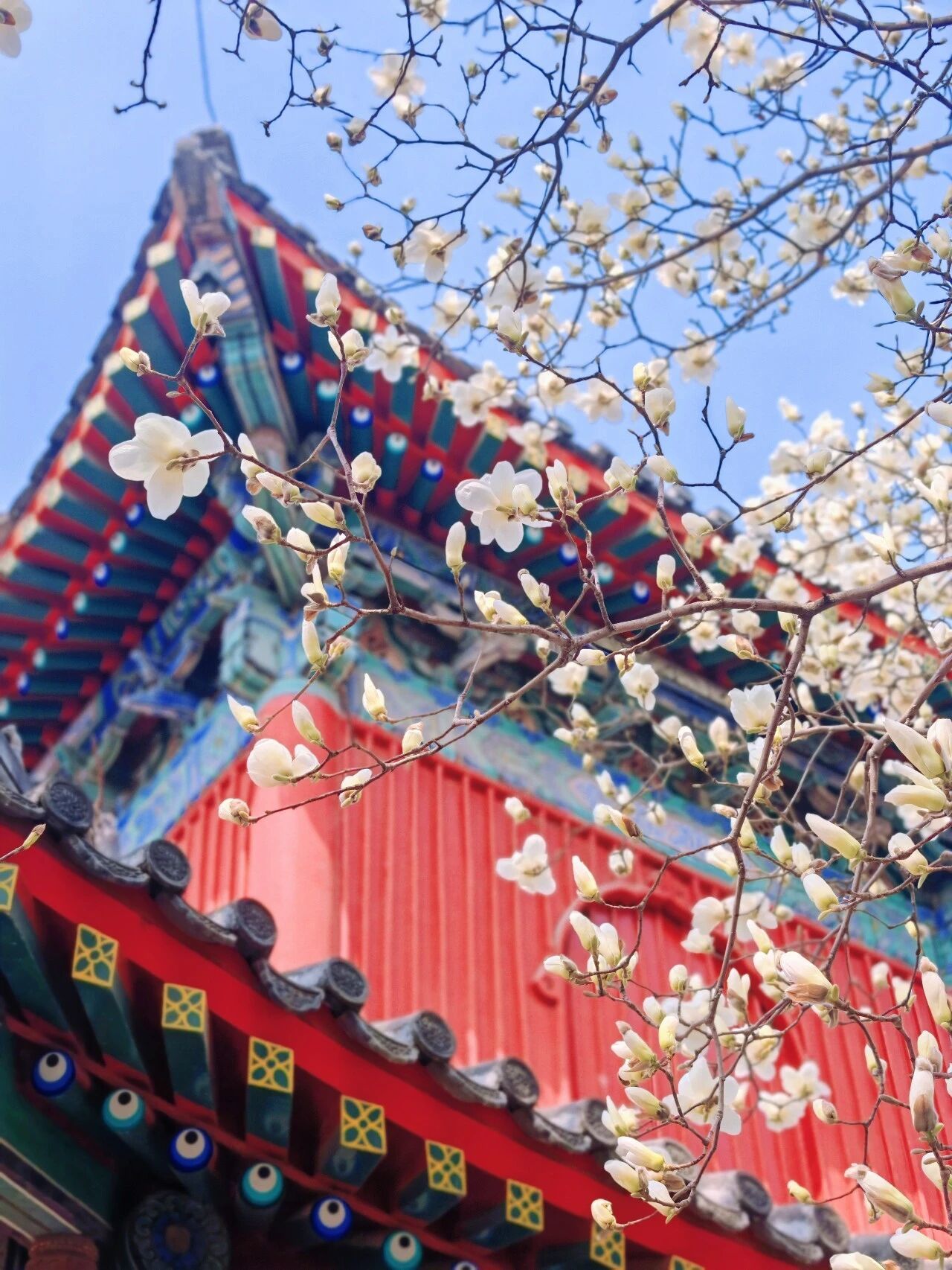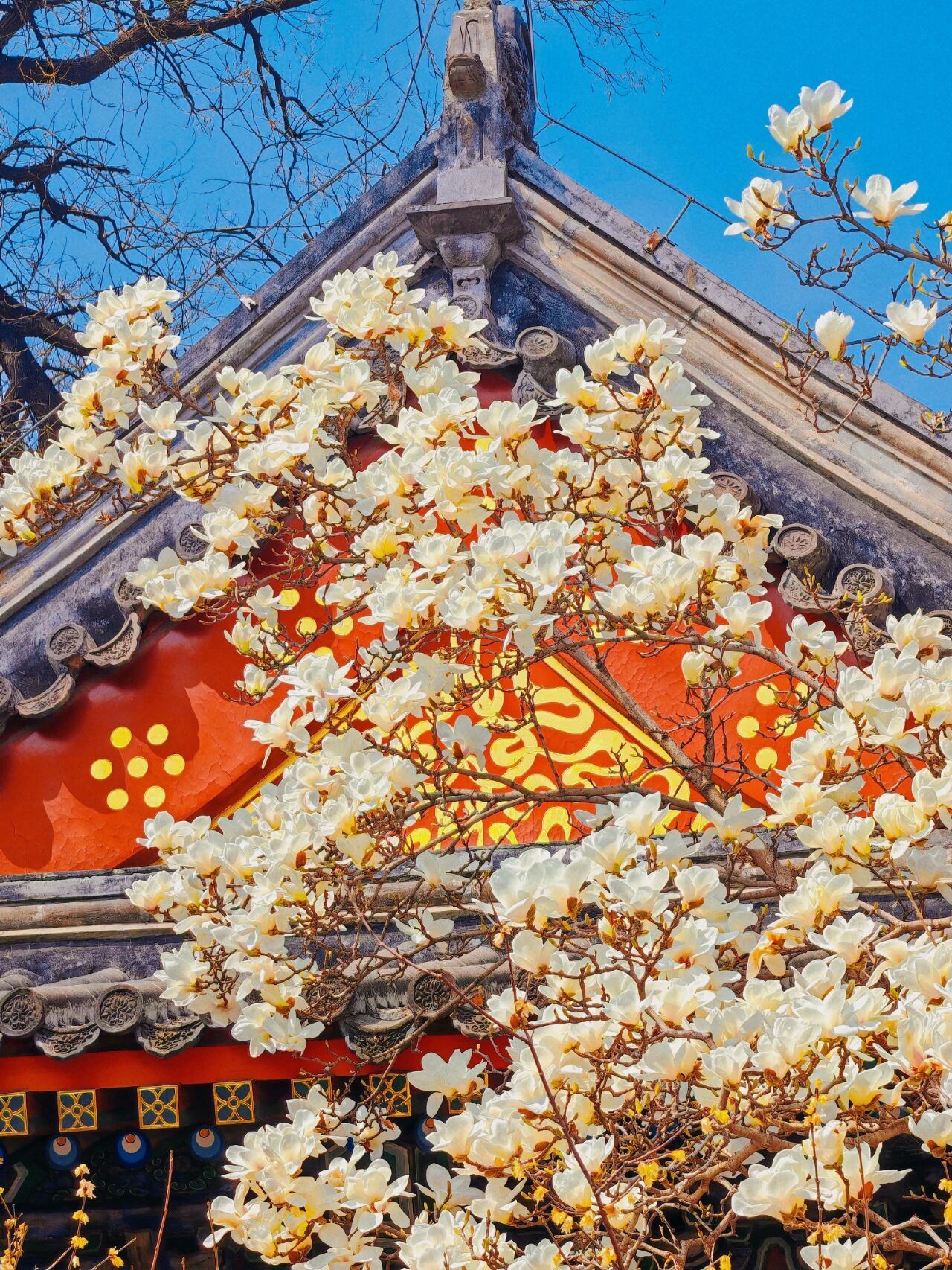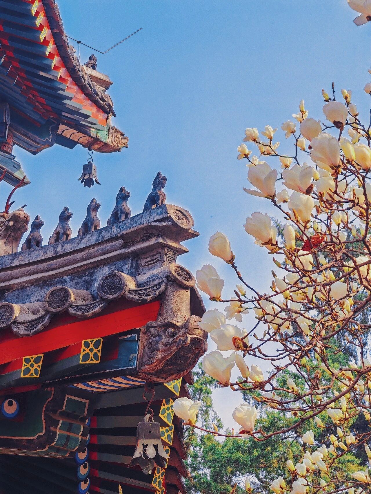2.尝试不同角度:低角度仰拍,可凸起玉兰花的挺拔清丽;高角度俯拍,能展现古寺与玉兰相映的全貌;侧面取景,则更能发达玉兰花舒展优雅的姿态。