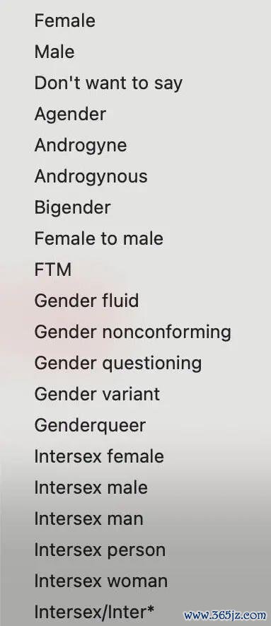 相比极度的是,除了常见的男性、女性和“不肯暴露”选项外,这份性别选项列表还包括了“无性别”(Agender)、“双性”(Bigender)、“性别招供扼制”(Gender questioning)等54种选项。