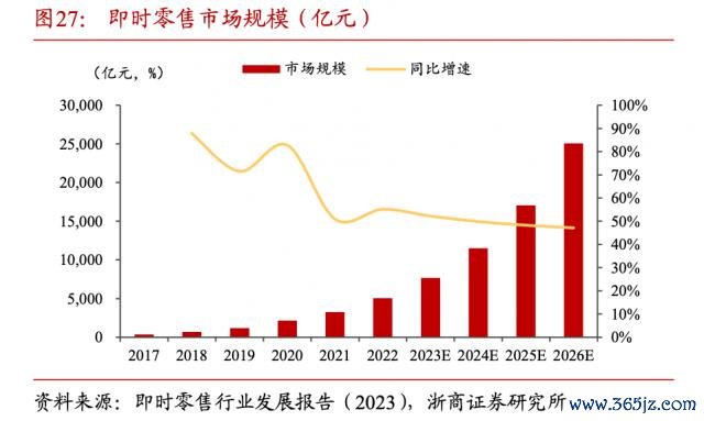 商务部国际贸易经济合营扣问院发布的《即时零卖行业发展请问(2023)》夸耀,即时零卖行业连年来保握 50% 以上的高速增长,2022 年市场界限已超 5000 亿元,瞻望 2025 年即时零卖市场界限将达到 2022 年的 3 倍。