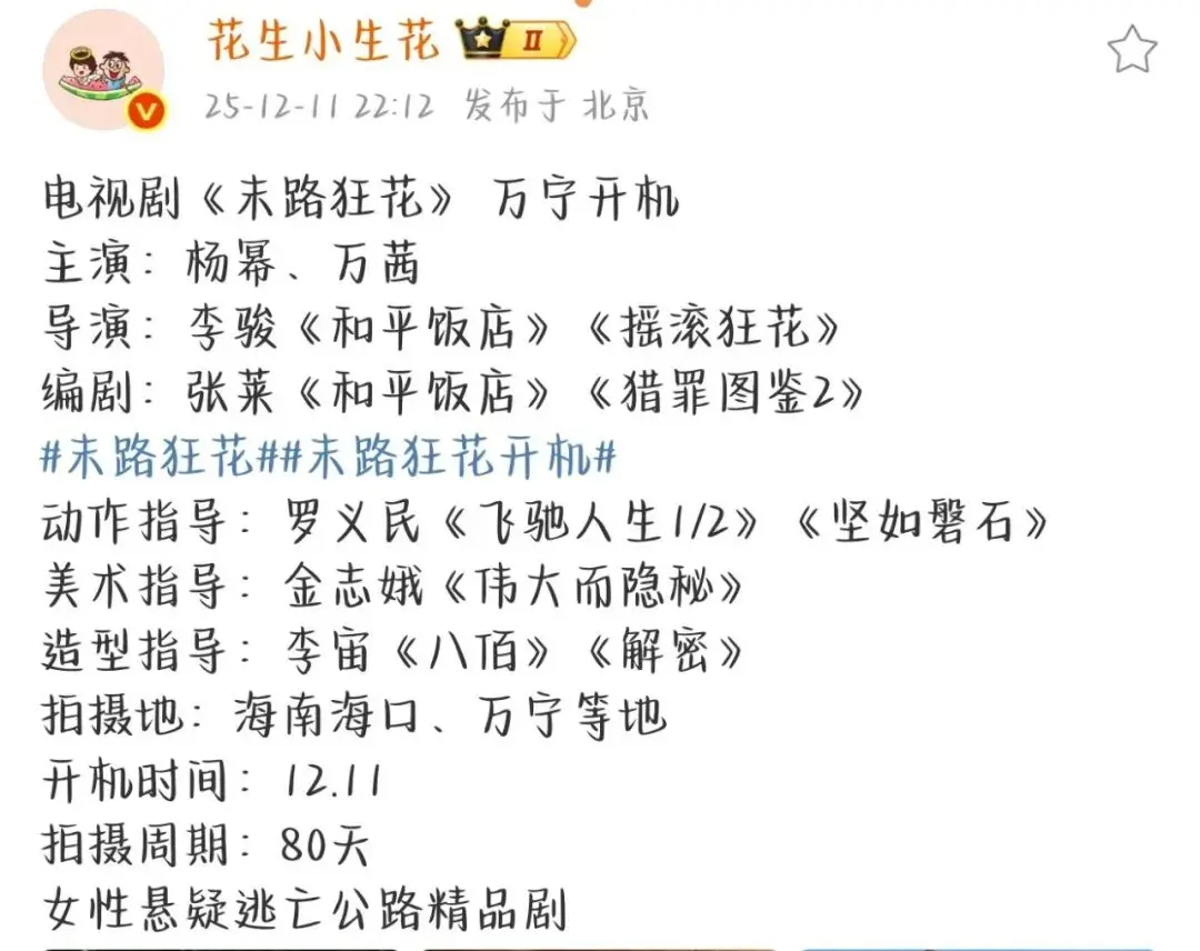 年末的影视圈终于放大招了!12 月 11 日,杨幂和万茜主演的《#死路狂花》精致开机,现场路透一出来,平直把我期待值拉到天花板!