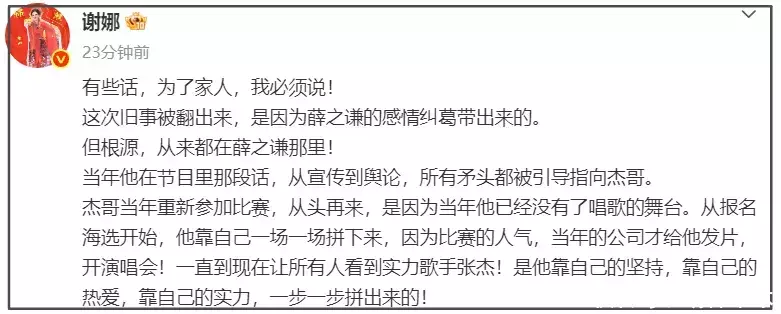 谢娜莫得小数连篇累牍,直指往事重提原因是受薛之谦情谊纠葛影响,也清晰她出来发声是看到薛之谦吐槽了,行为家东说念主,必须要讨一个刚正。她还提到另一桩往事,控诉薛之谦曩昔节目里的一段话把张杰推向了风口浪尖,被流毒误会多年。