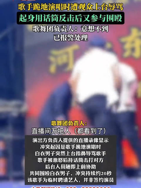 事情的启事竟源于一句打趣。据现场不雅众回忆,演员饰演前为活跃腻烦说“不鼓掌是小狗”,这本是舞台上常见的互动话术,却刺痛了某位醉酒不雅众的神经。监控画面暴露,白衣须眉上台后手指险些戳到歌手脸上,捏续口角近20秒。当歌手从跪地姿势猛地跳起,用发话器砸向对方头部时,矛盾澈底升级。歌舞团厚爱东说念主王先生过后强调:“他仅仅临时聘任的歌手,唱歌很好,那时绝对是被激愤了。”