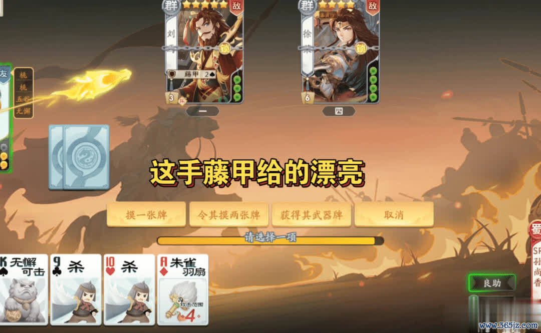 可能大家会合计,杀这张牌在游戏内部数目最多,独一咱们有藤甲,那就可以叛逆最多的伤害,但不要健忘咫尺的版块,玩家们在游戏内部都会有深入的去采纳带有属性的杀,岂论是增多伤害的火杀,如故大要形成伤害的雷杀,都会在游戏的中段被无数保留,依然莫得若干东谈主去采纳一个世俗的杀。是以,即便大要取得世俗杀带来的伤害也莫得太大的作用,更而且对方还会针对性的去采纳火焰类型的杀形成输出,根柢无法让咱们领有一个雄厚的存活率。