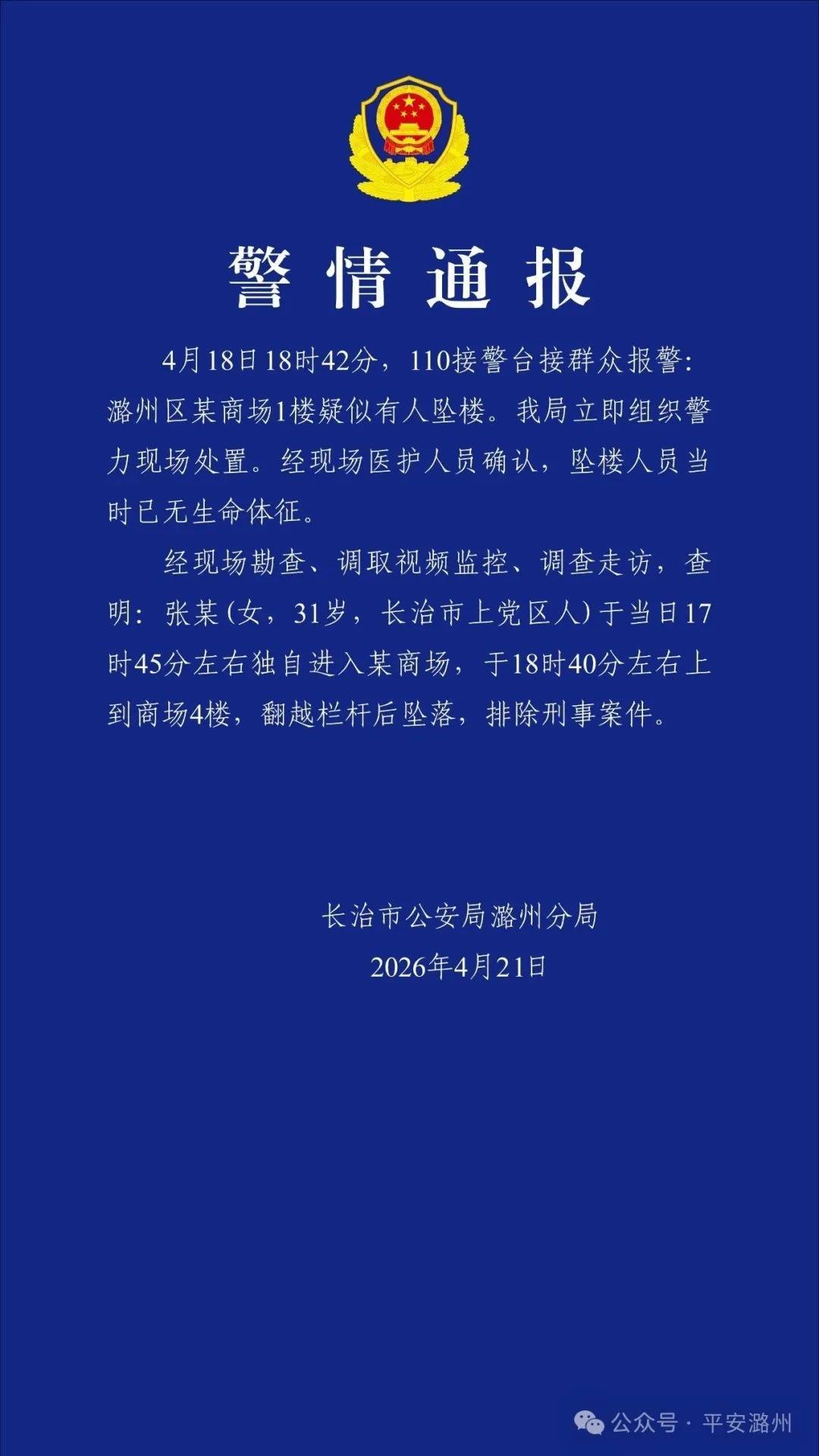 山西长治市公安局潞州分局4月21日发布警情通报。4月18日18时42分,110接警台接环球报警:潞州区某市集1楼疑似有东谈主坠楼。该局立即组织警力现场管束。经现场医护东谈主员阐明,坠楼东谈主员其时已无生命体征。