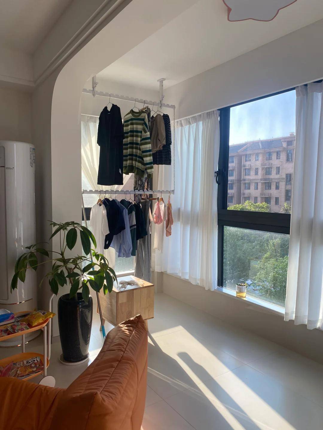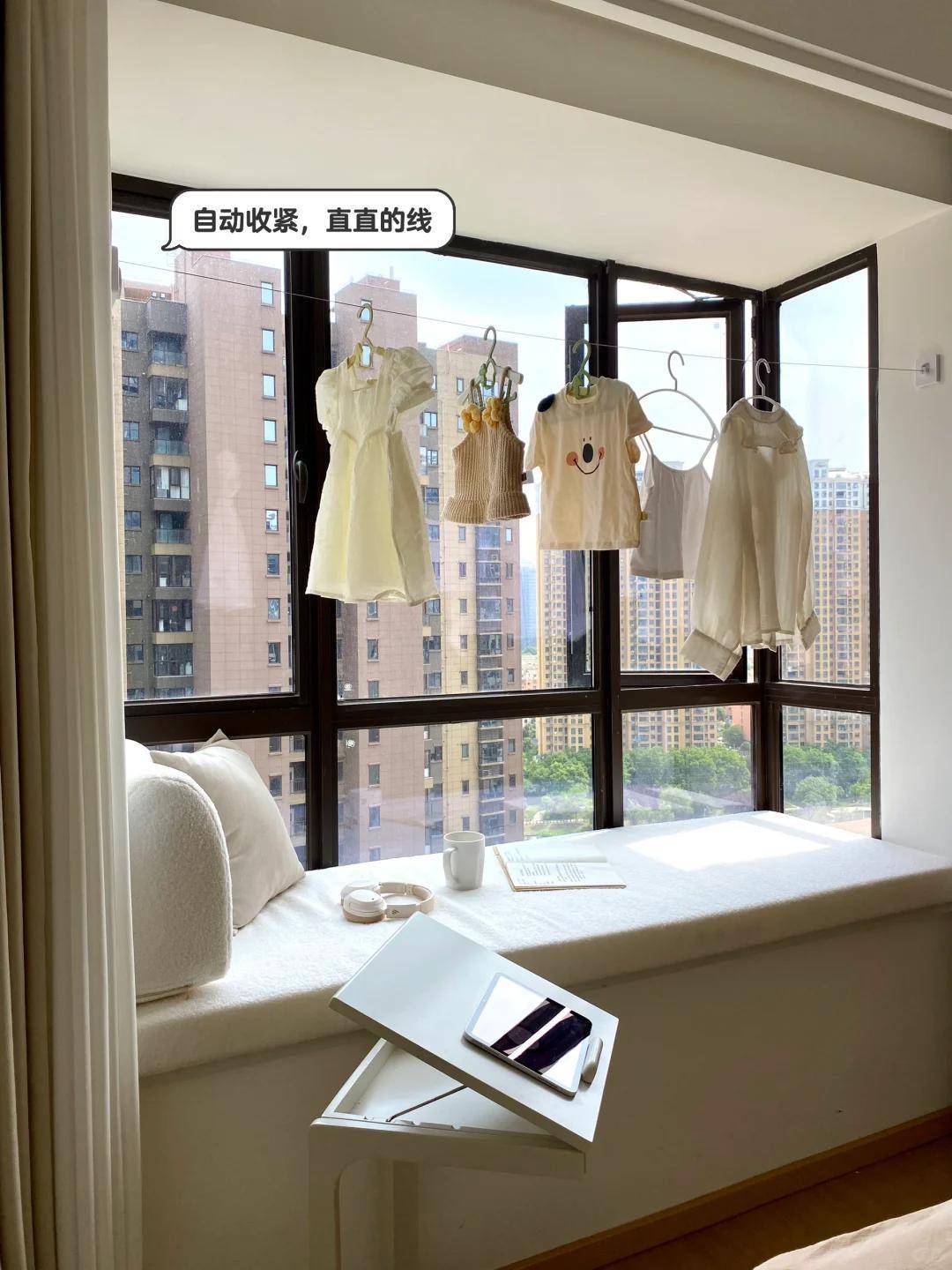 三、飘窗晾衣绳:鸡肋飘窗变实用,穿戴暗暗晒?家里有飘窗的在意了!别再让飘窗堆杂物了,装个可伸缩晾衣绳吧!钢丝材质的,需要时拉出来,毋庸时收且归,十足不影响飘窗使用。坐在飘窗上看书喝茶,穿戴就在傍边暗暗晾干,少许不贻误事儿!