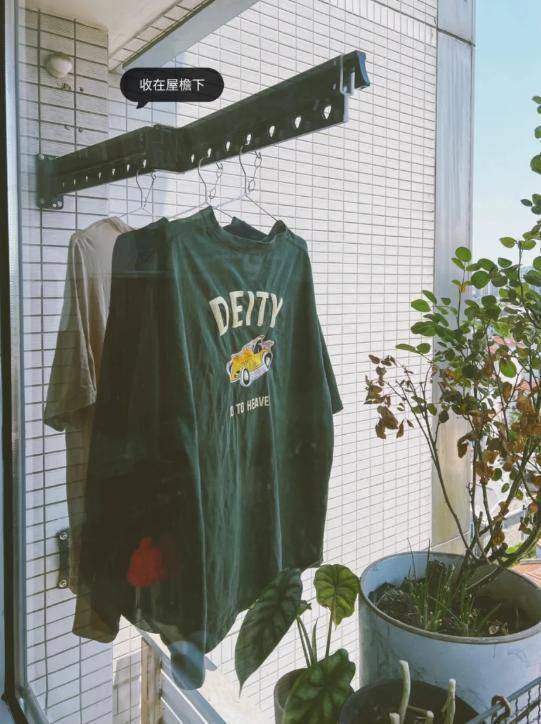 四、屋檐折叠晾衣架:室外晾衣不占地,风吹日晒干得快?如果家里有屋檐,不妨装个折叠晾衣架!正常收起来不占场地,晾穿戴时掀开就行。不外要在意别滴水影响邻居,大件衣物也别挂太多,免得被风吹跑。好天把穿戴挂这儿,太阳晒干的穿戴还有股香味呢!